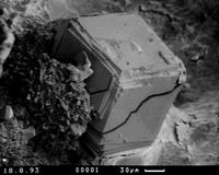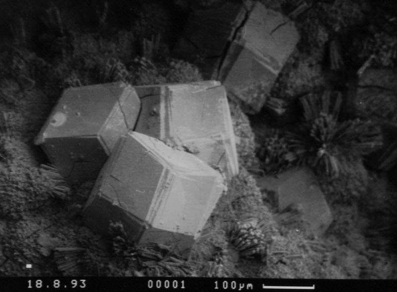 In einem Stück eines gelblichen Xenolithen, bei welchem noch deutlich die ehemalige Kornstruktur des Sandsteines zu erkennen war, fanden sich in den Zwickeln zwischen den Körnern Paulingit und Büschel feinster Erionitfasern auf dichten Rasen kleinster Phillipsite.